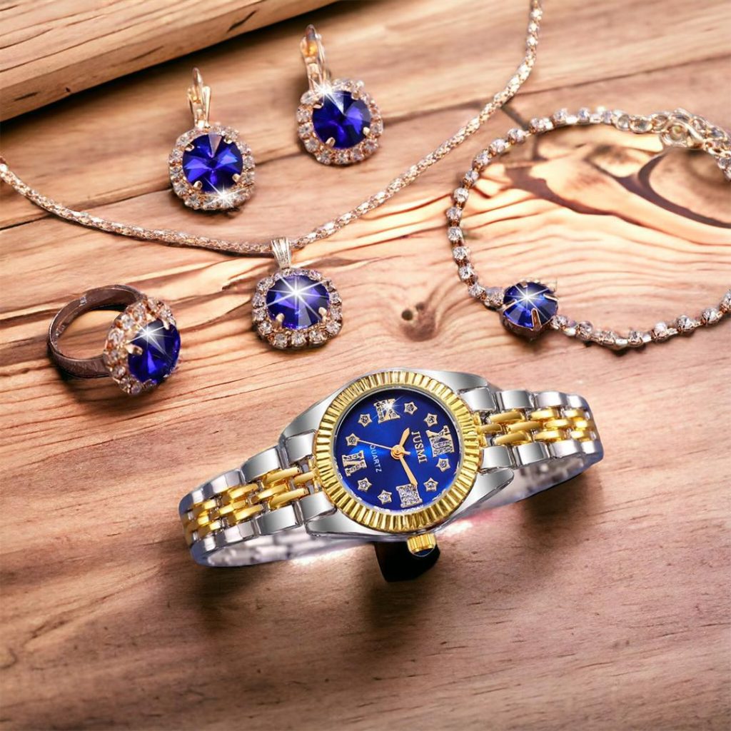 ست زیورآلات زنانه با ساعت و جواهرات آبی سلطنتی