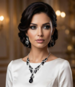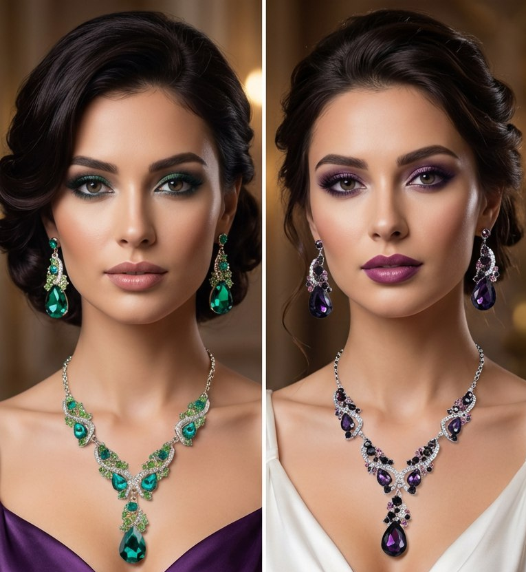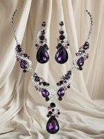 این ست جذاب شامل گردنبند و گوشوارههایی با نگینهای بنفش درخشان و کریستالهای ظریف است که جلوهای باشکوه به استایل شما میبخشد. طراحی خاص و ترکیب رنگهای چشمگیر، آن را به گزینهای ایدهآل برای مجالس و مهمانیهای ویژه تبدیل کرده است.